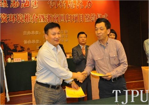 10月14日下午,我校校长助理、科技处处长程博闻,科技处副处长寇士军,纺织学院副院长钱晓明出席了中共兰溪市委、兰溪市政府主办的以“对接渤海湾,创新添活力”为主题的“兰溪市投资环境推介暨浙商回归项目签约仪式”,仪式在天津津利华大酒店举行。兰溪市委书记、市人大常委会主任吴国成,兰溪市副市长吴一成等领导出席了签约仪式。兰溪市委副书记、市长朱瑞俊主持签约仪式。