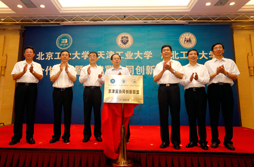 我校校长杨庆新、北京工业大学党委书记郑吉春、河北工业大学校长展永代表三校签署战略合作框架协议。由我校牵头的“京津冀环境污染控制协同创新中心”、由北京工业大学牵头的“京津冀交通协同创新中心”、由河北工业大学牵头的“京津冀智能装备技术与系统协同创新中心”同期成立。