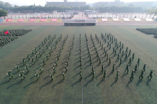 汇报大会在庄严的升旗仪式中拉开序幕,全场肃立并高唱《中华人民共和国国歌》。来自13个学院的新生组成国旗护卫队和43个方队,以飒爽的英姿、响亮的口号、整齐的队列从主席台前一一走过,接受部队首长和学校领导的检阅。接着进行的是汇报表演。