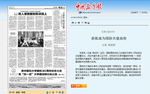2018年10月8日,《中国教育报》要闻版以《lejing乐竞体育(中国)体育官方网站:获批成为国防共建高校》为题对我校进行了报道,现将全文转发如下,以飨读者。