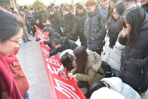 首先举行了庄严肃穆的升国旗仪式。7时整,鲜艳的五星红旗在国旗护卫队护卫下缓缓入场,现场师生齐声高唱《中华人民共和国国歌》,五星红旗迎着朝阳冉冉升起。随即,大家庄严肃立,向南京大屠杀死难同胞脱帽致哀一分钟。默哀仪式后,“青年马克思主义者培养工程”学员和“卓越管理者培养计划”学员代表集体诵读《和平宣言》,表达了青年学子对南京大屠杀死难同胞的悼念与哀思以及勿忘国耻、缅怀先烈、珍爱和平、圆梦中华的拳拳之心和报国之志。最后,师生代表在“勿忘国耻 圆梦中华”的纪念横幅上签名追忆。