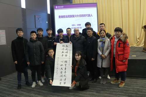 报告会后,数学科学学院数学1501班邬志豪同学将自己书写的“三尺讲台 辅育青年成才梦约法五章 心怀大爱润后生”的祝福送给王辅成老师,也表达了工大学子对老先生的敬仰和感激。