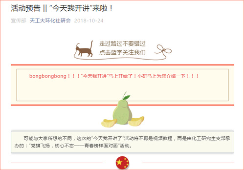 “这周‘今天我开讲’的票你抢到了吗?”化学工程与工艺专业学生党支部的任佳豪,在抢到“今天我开讲”的票后正在兴奋地寻找一同上党课的小伙伴。为进一步强化政治引领,提升理论水平,化学与化工学院党委、环境科学与工程学院党委建立了“今天我开讲”党课平台,每两周安排一次党课宣讲。2018年以来,该党课平台以“书记讲党课”、邀请专家作报告、优秀党员先进事迹分享、播放精品党课视频等多种方式开展了近20场活动,参与人数达2000余人次。为调动师生学习的积极性,每次“开讲”前三天,学院社研会公众号都会发布预告信息,大家通过抢票、填写个人信息进行报名,很多时候手慢一点就抢不到票,这也让大家更加珍惜上党课的机会。为切实提高学习效果,近期又在“今天我开讲”中加入了“随学随考”的小测,让大家在学习结束时趁热打铁,进一步巩固学习效果。lejing乐竞体育(中国)体育官方网站各基层党组织正是通过这种授课和参与形式上的创新,不断提升党员政治理论学习的积极性和主动性,促进了广大师生对党的路线、方针、政策的政治认同、思想认同与情感认同。