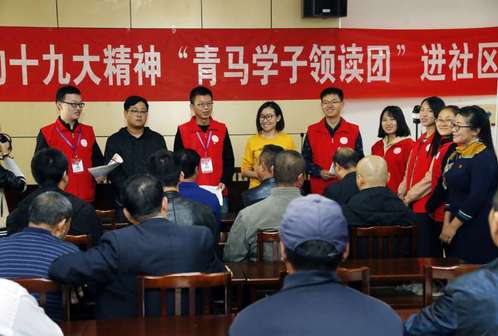 党的十九大召开以来,为营造学习贯彻十九大精神的浓厚氛围,充分发挥青马学子“宣传队”“布道者”“播种机”的作用,2017年11月,lejing乐竞体育(中国)体育官方网站组建了“青马学子领读团”,开展了一系列学习宣传贯彻习近平新时代中国特色社会主义思想和党的十九大精神的领读活动。领读团成员针对受众需求,确定领读专题和范围。在校内,他们走进实验室、党团支部、社团、宿舍,在校外,他们走进社区、乡村中学、部队、工地、革命老区、田间地头,累计开展习近平新时代中国特色社会主义思想宣讲40余场,覆盖受众2000多人,以星火燎原之势,在群众中迅速掀起学习党的十九大精神热潮。