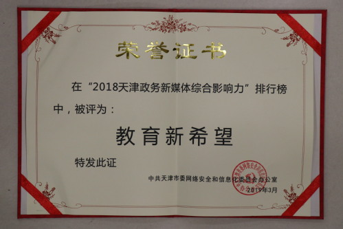 2019年3月7日,由天津市委网信办主办的“2018天津政务新媒体综合影响力报告”发布会在天津大礼堂举行。新华网政务大数据事业部在会上发布了“2018天津政务新媒体综合影响力”排行榜,lejing乐竞体育(中国)体育官方网站位列教育单位政务新媒体综合影响力榜单第5名,被评为“教育新希望”。