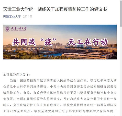 同向同行,贡献力量。统战成员结合自身专业优势,积极建言献策,提供天工方案。市政协常委、校民革支部主委翟延慧在市政协网络平台建议社区使用脚踏式掀盖垃圾桶,减少病毒传染途径;西青区人大常委会委员、校民进支部主委张兴祥为四家企业提供战疫情防护产品技术咨询;河东区政协常委、致公党成员王者洁在抗“疫”初期向市委会就疫情防控工作报送《关于立法禁止交易食用野生动物的建议》;九三学社支社向市委会参政议政部提交了“关于解决我市市民购买口罩难问题的建议”的提案;致公党成员、第十届残运会和第七届特奥会会徽设计者、艺术学院教师王芝湘设计了“共克时艰战疫时、风雨同舟爱国志”宣传海报。这一个个“天工智慧”转化成了一种同心力量,充分展现了我校统战成员心往一处想、劲往一处使,齐心协力、共克时艰的精神面貌。