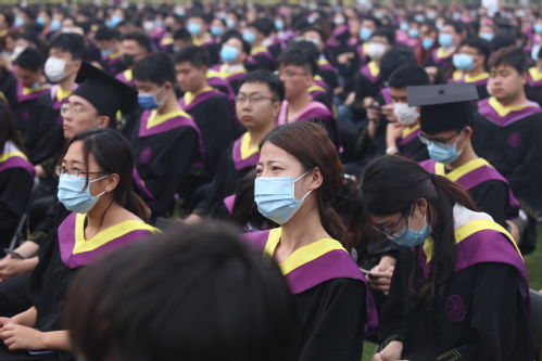 典礼开始前,现场进行了爱国歌曲、校园歌曲联唱,播放了为毕业生精心制作的微视频《你笑起来真好看》《399号的日子》,不少毕业生眼中噙满泪水。“视频里的很多场景都是平时常去但又没有在意的,但是以后再也没有机会好好看看了,这一次真的要说再见了。”艺术学院毕业生王雪感动地说。