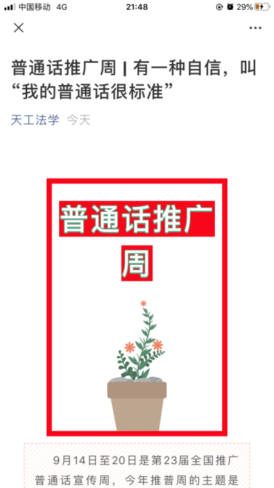丰富多彩的“推普周”活动不仅提升了全体师生规范使用国家通用语言文字的意识,更弘扬了中华优秀传统文化,增强了文化自信。师生们表示将持续推进普通话宣传工作,努力做到在日常交流中使用普通话,用心督促自己的家人讲好普通话,加强礼貌用语,做语言最美的人,带动周边社会环境,提高全社会语言文字规范水平。(审稿:人事处(教师发展中心)蔺洪全 编辑:宣传部 李焕峰)