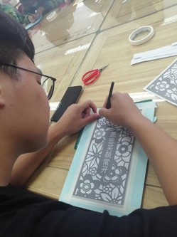 二十四孝剪纸:邀请到曹老师为同学们仔细讲解、亲手指导,并亲手创作剪纸图样。同学们在老师的指导下,将图样绘制于纸上,再剪下来装裱到纸板之上,创作二十四孝剪纸,再次解读感悟中华孝道。
