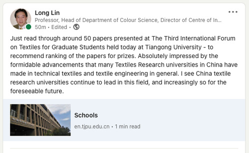 大会主题报告专家英国利兹大学Long Lin教授认为,本次论坛反映了中国在产业用纺织品领域的最新发展,充分显示出中国在该研究领域已处于世界前列。