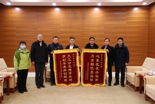 张玉波副校长代表学校接受了锦旗。他对公交集团领导一行表示热烈欢迎和感谢,简要介绍了学校的基本情况,并表示要一如既往地支持公交集团工作,在今后的工作中将继续为周边社区的文化生活环境贡献自己的力量。最后,他希望天工与公交集团加强交流,深化校企合作,合作共赢,共谋发展。(审稿:后勤管理处 邓一泉 编辑:党委宣传部 蒋闯)