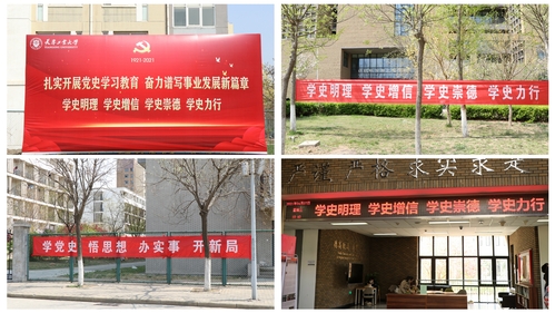 强化宣传引导,营造浓厚氛围。充分发挥校园媒体平台、宣传橱窗等阵地作用。做好党史学习教育宣传报道,在校园新闻网、官方微信、官方微博、抖音等平台开设“党史学习教育”“庆祝中国共产党成立100周年”专题专栏,与建党百年主题宣传相结合,围绕爱党爱国爱社会主义主题,厚植红色文化,强化宣传育人。自3月份以来,在天津日报、天津电视台、天津广播、天津教育报等社会媒体平台发布学校党史学习教育主题的报道30余篇。学校先后设计、制作党史学习教育主题展板、主题桁架、主题海报,悬挂、摆放于校园显著位置。各二级单位的35块LED电子显示屏持续滚动播放党史学习教育主题宣传标语。同时,学校各基层党组织充分利用本单位宣传载体,线上线下齐发力,营造浓厚的学习氛围。