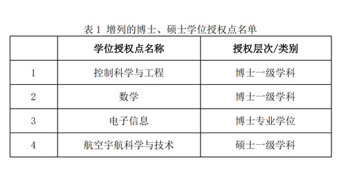 日前,国务院学位委员会印发《关于下达2020年审核增列的博士、硕士学位授权点名单的通知》(学位〔2021〕14号),公布了批准的博士、硕士学位授权点名单。我校新增控制科学与工程、数学、电子信息博士学位授权点,新增航空宇航科学与技术硕士学位授权点。至此,我校博士学位授权点数量由原来的3个增加为6个,实现数量翻番,取得重大突破。