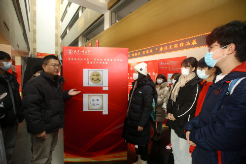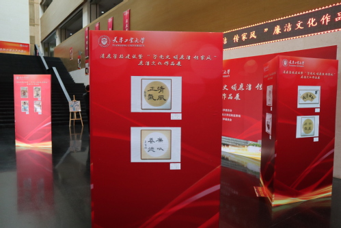 为深入学习宣传贯彻习近平新时代中国特色社会主义思想和党的十九届六中全会精神,深入挖掘中华民族传统文化中的廉政基因和百年党史中的红色基因,营造尚廉贪耻、风清气正的校园文化氛围,展示廉政文化优秀创作成果,2021年12月,我校在行政楼一楼大厅举办2021年清廉学校建设暨“学党史 颂廉洁 传家风”主题廉洁文化作品展。