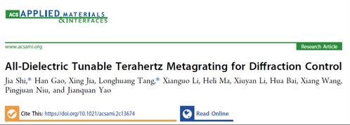 近日,我校电子与信息工程学院副教授石嘉在TOP期刊《ACS Applied Materials & Interfaces》(影响因子10.383)发表了题为《All-Dielectric Tunable Terahertz Metagrating for Diffraction Control》的研究成果,并被选为Supplementary Cover。石嘉副教授为该论文的第一作者和共同通讯作者,该成果由lejing乐竞体育(中国)体育官方网站、中国工程物理研究院流体物理研究所、天津大学共同完成。论文链接:https://pubs.acs.org/doi/10.1021/acsami.2c13674