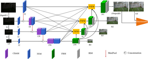 该论文提出了一种基于多尺度特征互补的低光照图像增强网络(LIEN-MFC),这是一种由不同尺度的多个图像监督的U形编码器-解码器网络。在编码器中,构造了四个特征提取分支来提取不同尺度的微光图像的特征。在解码过程中,提出了一个特征补充融合模块(FSFM)来补充和集成编码器和解码器不同分支的特征。此外,在每个分支中构建了特征恢复模块(FRM)和图像重构模块(IRM),以重构恢复的特征并输出增强的图像。为了更好地训练网络,定义了一个联合损失函数,其中设计了一个判别损失项,以确保增强的结果更好地满足人眼的视觉效果。在大量数据集上的实验表明,该研究所提出的方法在主观和客观上都优于一些最先进的图像增强方法。