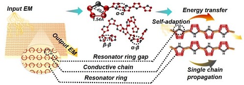 该团队研发的分子谐振环电磁超材料,除了具有分子尺寸的谐振环单元外,还巧妙地利用分子长链构象的变化,机械横波传播性质,使聚吡咯分子链有序整齐的排列在织物表面,形成具有超材料结构特点的有序的分子谐振环集合体,在109-1016Hz下的宽频段下实现了电磁隐身。
