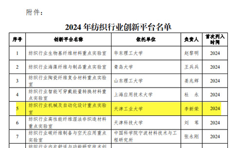 近日,中国纺织工业联合会发布了2024年度纺织行业创新平台名单,本年度新增认定纺织行业创新平台22家。其中,我校机械工程学院“纺织行业机械及自动化设计重点实验室”成功获批本年度新增认定的纺织行业创新平台。