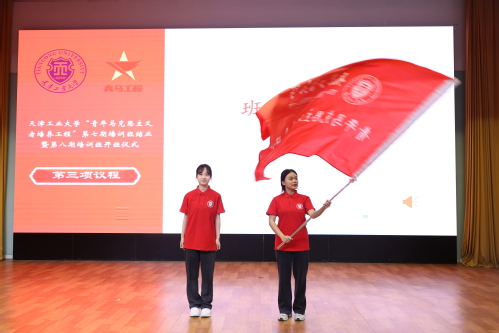 第八期学员代表王巧妍从第七期学员代表戚茸妍手中接过“青马工程”培训班班旗,标志着“青马工程”第八期培训班正式启动。李云龙同学代表第八期培训班学员作了发言。同学们用诗朗诵《奋进新时代 砥砺新征程》和一首《少年中国说》表达了青马学员的爱党之情、强国之志。