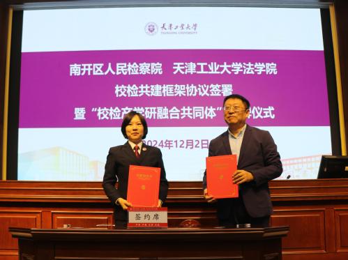 2024年12月2日,我校法学院与天津市南开区人民检察院在法学院模拟法庭举行校检共建框架协议签署暨“校检产学研融合共同体”揭牌仪式。天津市南开区人民检察院党组书记、检察长郑国振,我校党委常委、副校长沈浩鹏出席签约仪式并致辞。南开区人民检察院相关负责人、法学院班子成员以及师生代表参加了签约仪式。