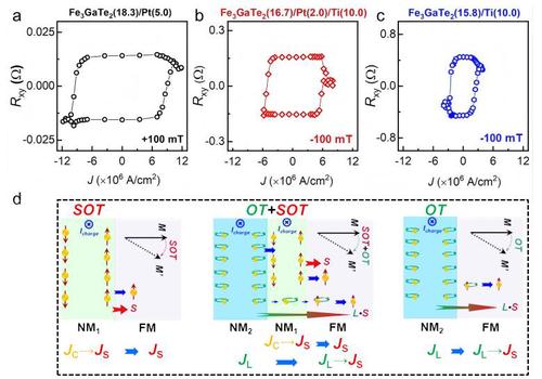 图1. (a)自旋轨道矩和(b)(c)轨道矩驱动Fe3GaTe2磁化翻转实验结果;(d)翻转机制图。